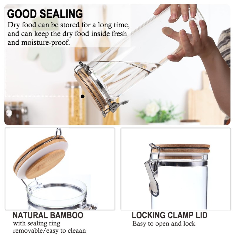 - Glass storage canister with airtight locking clamp lid: equipped with locking clamp and silicone sealing ring to achieve airtight sealing and keep the dry goods inside fresh. The lid is firmly secured to the jar and maintains the quality of your stored items over time. The lid opens effortlessly—simply release the clamp to access your items with ease.