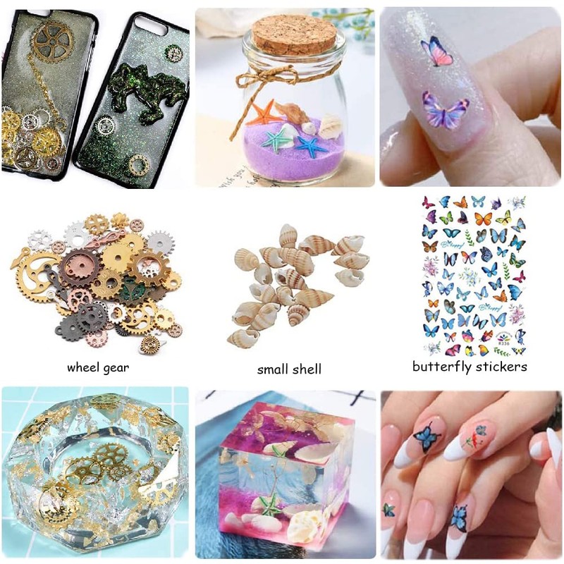 • Decoration set for resin accessories: the package contains 12 glasses of sequins glitter, 12 glasses of fine glitter, 16 pieces dried flowers, 3 bag packs of mylar flakes, 2 bottles of foil flakes, 1 box of wheel gears, 1 bag of small shell, 1 butterfly sticker, 1 tweezers. A great resin accessory for making resin jewellery, nail art and DIY crafts.