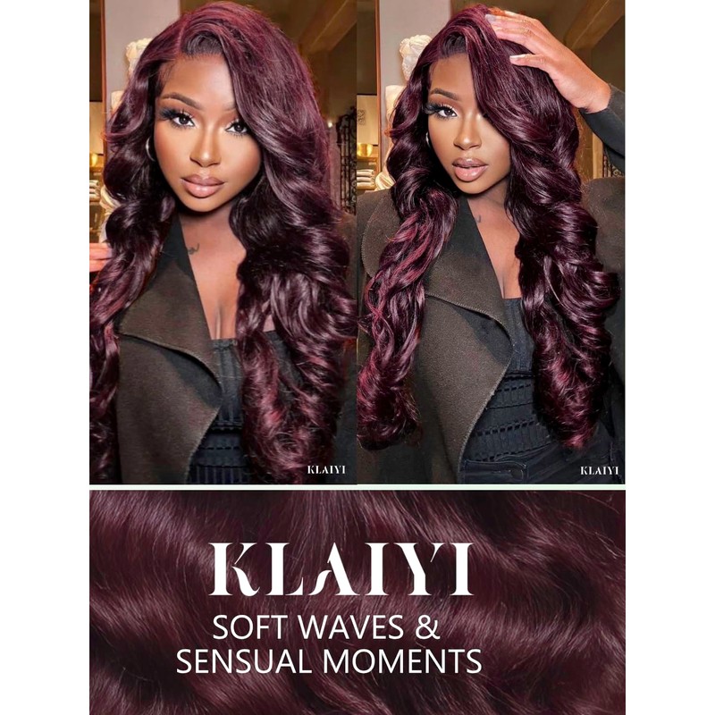 KLAIYI Black Cherry Loose Body Wave Bye Bye Knots Glueless Wig 7x5Precut Lace Front Wigs Human Hair Drawstring Pre Plucked Bleached 30S Ready to Wear and Go Wig with Face Framing Bangs Burgundy 16Inch
