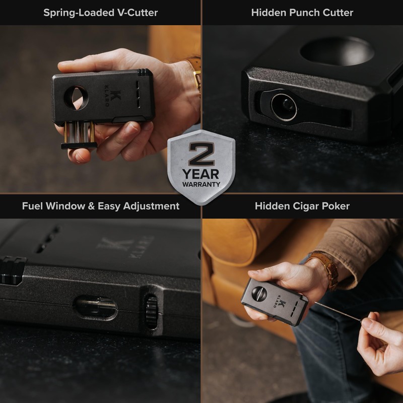 - The Ultimate Cigar Tool (Lighter, Cutter & More) – No more scrambling for accessories. The Overland Pro combines a built-in V-Cut, a fold-out punch cutter, and a hidden cigar poker, giving you everything you need in one rugged, travel-ready lighter.