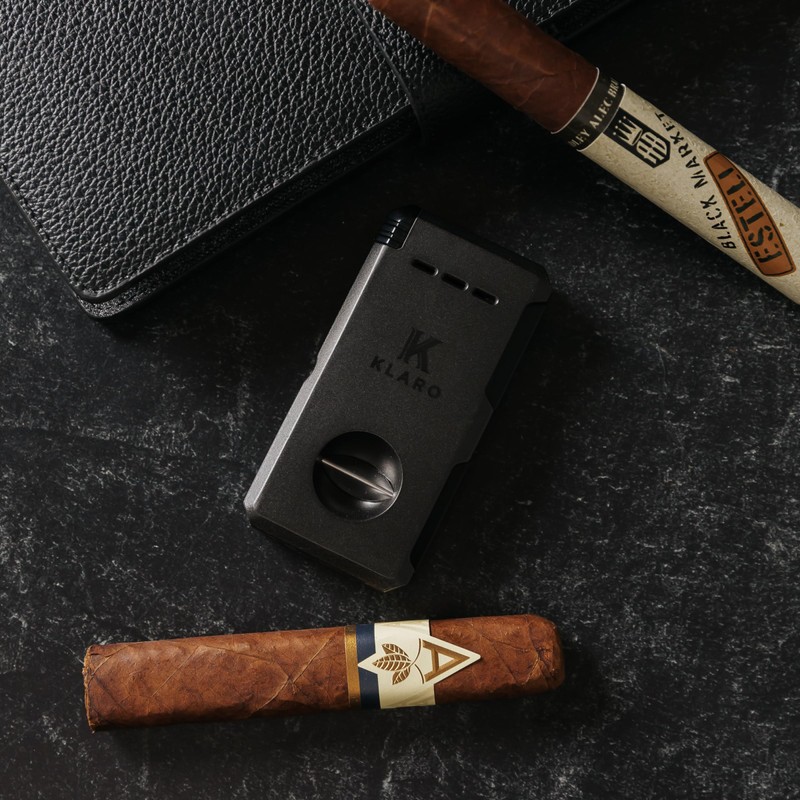 KLARO Double Torch Lighter and V-Cut Cutter, Spring-Loaded V-Cut, Swivel Protective Flame Cover, Hidden Poker, Gift-Ready with Silicone Sleeve, Black Finish, Cigar Lighter for Men