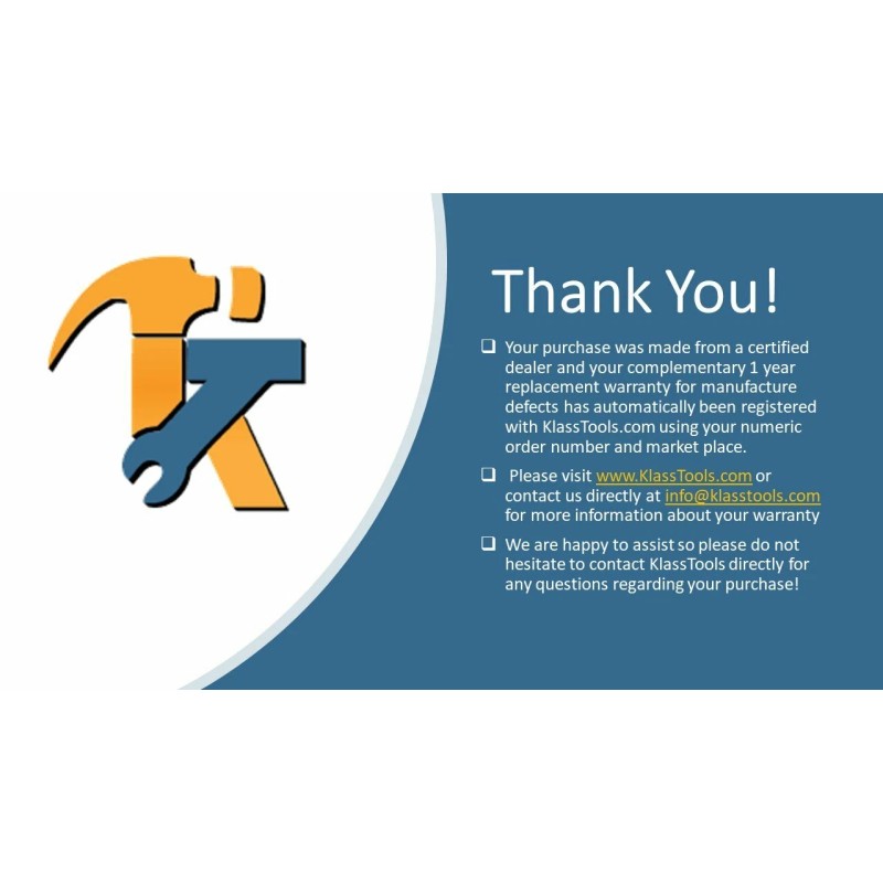 - Comes with a 1 Year Manufacturer Replacement Warranty from KlassTools.