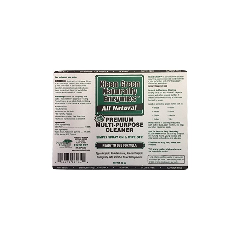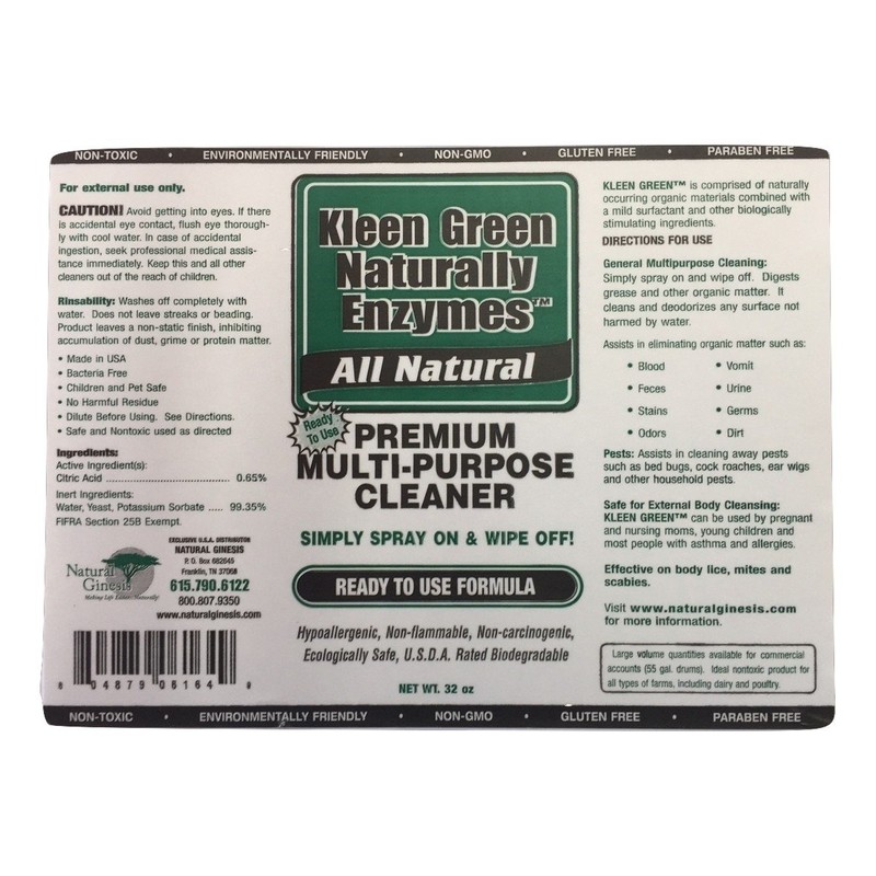 Don’t settle for imitations! Kleen Green is a unique organic blend of enzymes that is richer and stronger than the competition. Kleen Green is an enzyme cleaner. Our revolutionary formula is designed to assist in removing and eliminating dirt, germs, bacteria, and odors. Kills by contact bed bugs, lice, naturally! It is hypoallergenic. Enzyme cleaners are now available to all consumers, but have been used widely in restaurant, health care, restaurant and institutional settings for many years, due to their low toxicity and superior cleaning properties. Kleen Green penetrates and emulsifies all types of grease and organic matter on all surfaces. It is an environmentally- friendly alternative to harsh cleaning chemicals and is highly effective for cleaning all surfaces including tile, walls, floors, carpets, rugs and upholstery. This unique and highly effective product is specifically designed to clean and biodegrade organic stains such as blood, vomit, urine, waste, food and other such difficult stains. Kleen Green attacks stains at first application then continues working to safely biodegrade the residual traces of these organic stains. Especially effective on hard-to-clean surfaces such as tile grouting, corners, cracks and crevices where germs colonize, plus carpets and furniture where removal of organic stains is difficult.