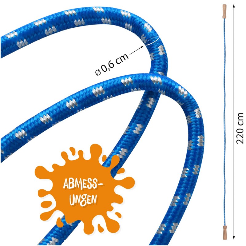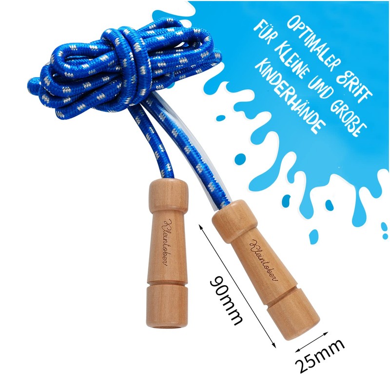 - Skipping rope of the highest quality: our Kleintober jumping rope in blue meets the highest quality requirements. Made for the most part from environmentally friendly materials. The wooden handles made of juniper wood are smoothly polished and are ergonomically perfect for small hands as well as for large ones. The nylon fleece rope has a length of 220 cm and is easily adjustable as required. You will appreciate the very high quality of this swing rope