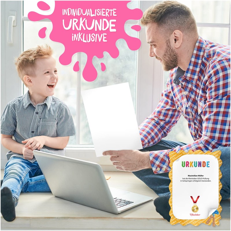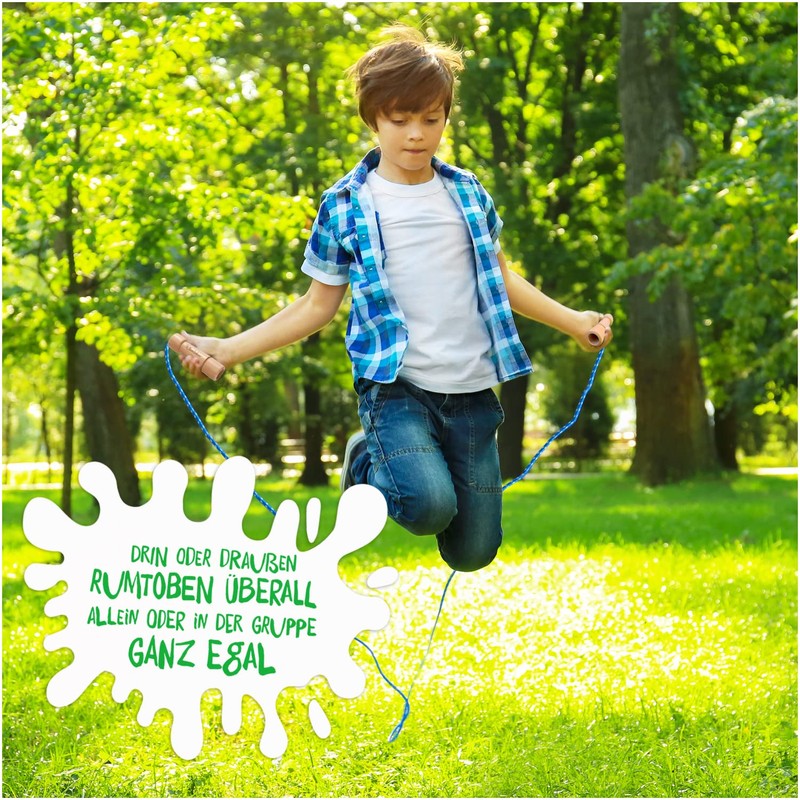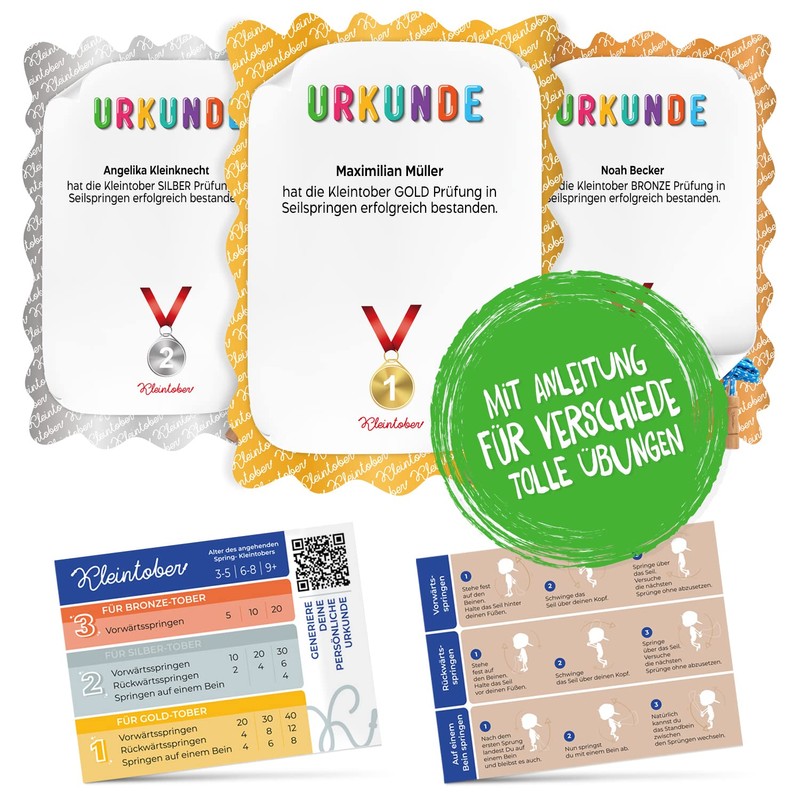 - Enthusiasm for the whole family: Kleintober combines sports equipment for children with a thoughtful toy concept to facilitate motivation and learning. The Kleintober skipping rope set contains an exercise guide in addition to a high-quality skipping rope for children. In addition, the jump rope children's set comes with a QR code for a personalised certificate, which you can solemnly give to your child when they manage the jump rope exercises according to the enclosed instructions (English language not guaranteed)