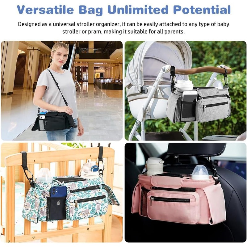 - 【Various Methods of Use】 Convenient stroller organiser for most prams! Besides being attached to the stroller, the shoulder belt is easy to attach and can also be used shoulder-hung style. It can use velcro straps or hooks hung from a wheelchair, cot, etc. or carried in the hand,It can be used all year round, regardless of age or location.