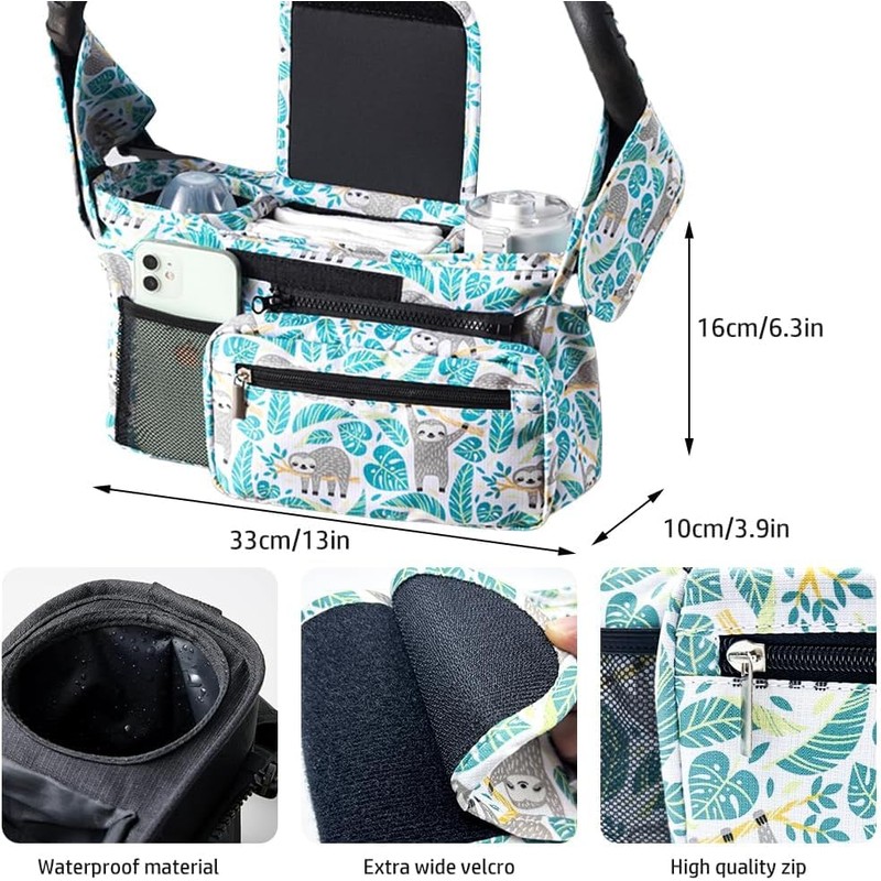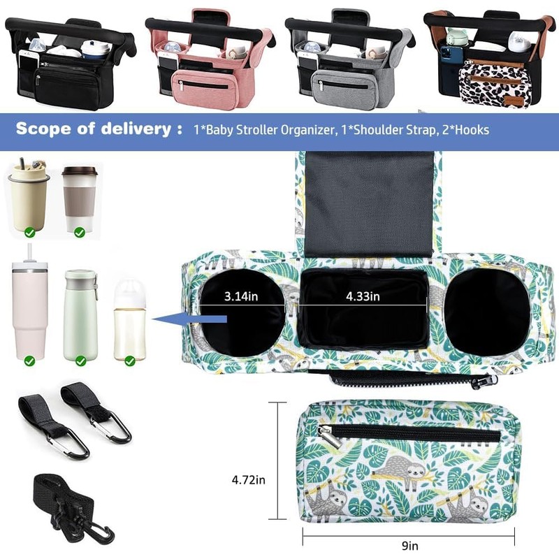KLERICER Baby Stroller Organizer, Universal Stroller Organizer with Detachable Phone Bag, Stroller Caddy with 2 Insulated Cup Holders, Buggy Organizer Bag with 2 Hooks Fits Most Strollers (Sloth)