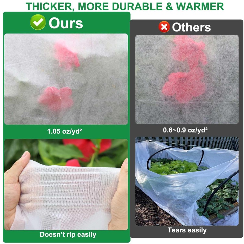 - Thickened & UV Stabilized After trial comparison, KLEWEE plant covers adopted 1.05 oz/yd? high quality spun polypropylene fabric, lightweight & breathable, allows air, sunlight and moisture to reach your plants; Also robust enough and doesn't rip easily, our plant frost blanket is thicker and warmer, more tear resistant than less expensive 0.6~0.9 oz/sq fabric. In addition, 2% UV protective agent has been added, UV stabilized and reusable, provide your plants with better and endured protection