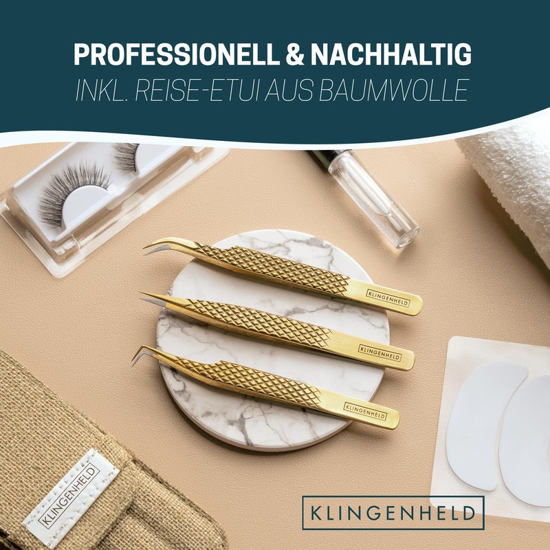 KLINGENHELD® NEU Profi Wimpern Pinzetten Set mit ComfortGrip-Spitzen & Anti-Rutsch Griff - Maximaler Halt & höchste Präzision - inkl. Baumwoll-Etui 100% nachhaltig - Pinzette Wimpernverlängerung