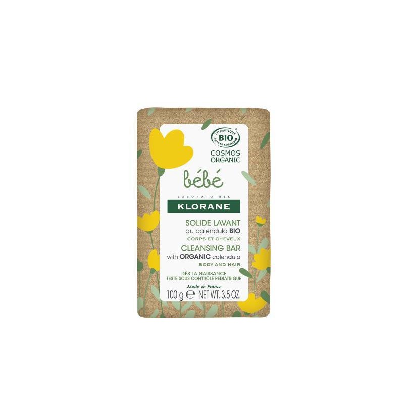 Klorane Baby Solide Lavant Bio 100 g is a calendula-based solid soap for body and hair. It moisturizes and gently washes without drying baby's skin.