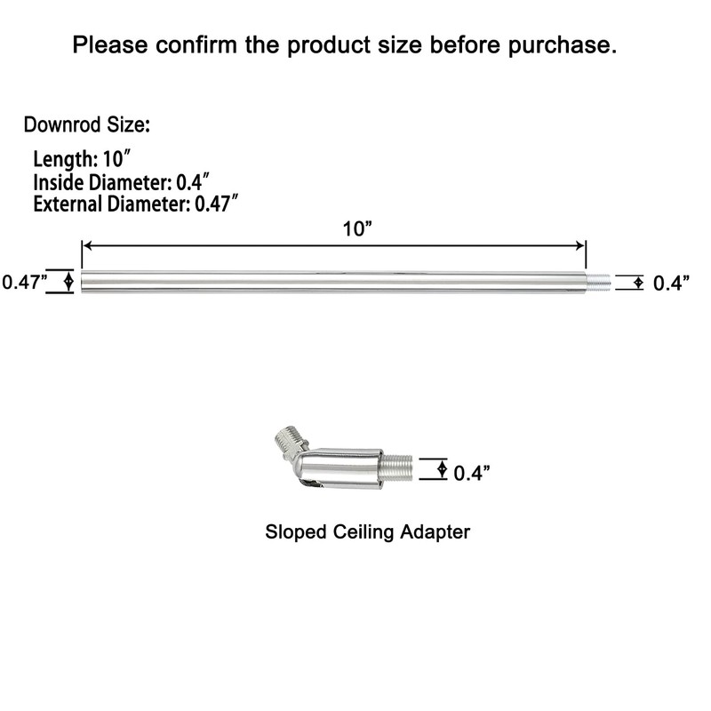 - Downrod size: 2/5 in. Diameter x 10 in; Sloped ceiling adapter: 3/4 in. Diameter. Suit for M10 thread