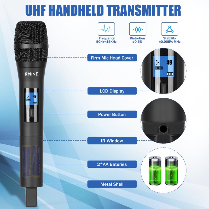 Kmise Wireless Microphone System, Dual Wireless Mics,Auto Scan & IR Pair Cordless Mic, 2x50 UHF Adjustable Frequencies for Church, DJ, Karaoke,Wedding, Party,200Ft Range