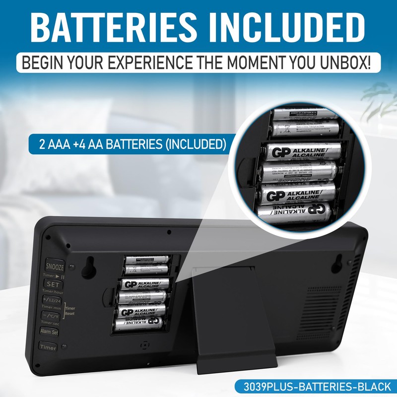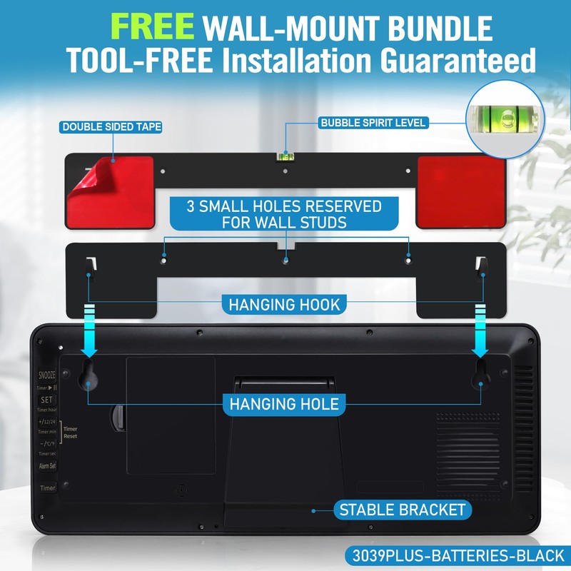 - 【Battery Operated Digital Wall clock】This digital clock is powered by 4 AA batteries and 2AA batteries (Included), you can put the clock wherever you like. There are two keyholes for easy wall mounting and a fold-out backstand for tabletop or shelf placement.
