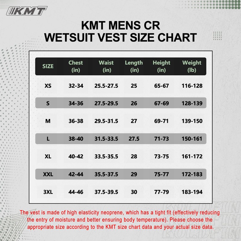 - Please choosing through KMT size chart. You may feel a tight fit when wearing the wetsuit, but this is normal and ensures good buoyancy and warmth.