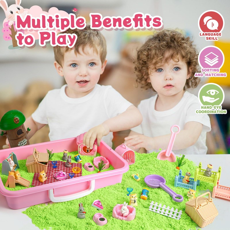 - Rabbit and Hamster Sensory Bins: This sensory toys includes 4 rabbit figurines,4 hamster figurines,2.2lbs colored sensory play sand,1 tree house,2 pet house,3 sand tools,1 slide,picnic accessories and so on.This 38pcs accessories can spend kids more time to fun play