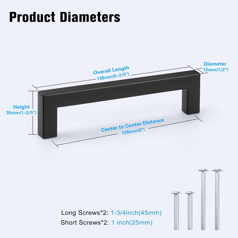 - ★MEASUREMENTS - CC: 128mm(5"), Overall Length: 140mm(5-1/2"), Width: 12mm, Projection: 1-2/5"; Screws: 25mm/ 1" . Fit for 14mm(0.55")-19mm(0.75") door thickless.