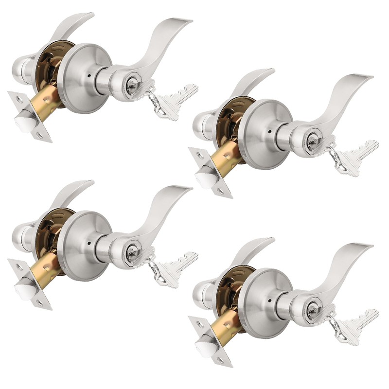 KNOBWELL 4 Pack Entrance Door Handleset Keyed Entry Front Door Levers with Lock and Key Brushed Nickel Exterior Door Handles(Same Key)
