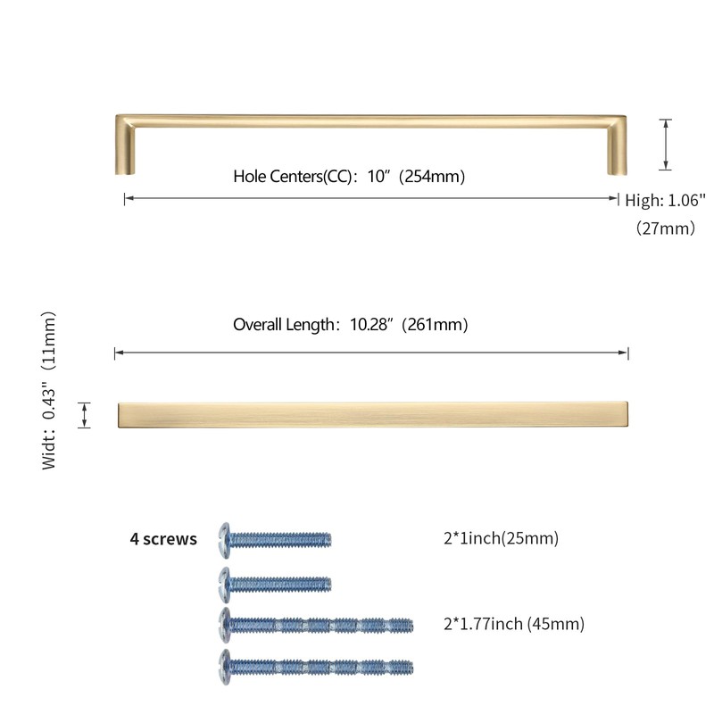 - Cabinet Pulls Dimensions - Hole Centers(CC):10"(254mm); Overall Length:10.28"(261mm); Width:0.43"(11mm), Projection: 1" (27mm)