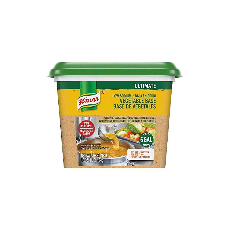 Easily achieve a rich mirepoix flavor with Knorr Ultimate Low Sodium Vegetable Base. Made from onions, carrots, and celery, this gluten free vegetable broth base offers a time saving and cost efficient means of developing flavor in soups, stocks, sauces, and more. It comes in a versatile, easy to use paste format that excels in a variety of applications from creating hearty vegetable stocks to giving pasta dishes a flavorful boost. Designed with your kitchen and customers in mind, this vegetable soup concentrate is made with colors from natural sources and contains no added MSG or artificial flavors or preservatives. It is gluten free, low in sodium, and vegan.