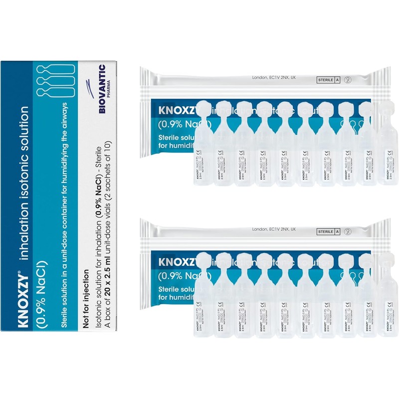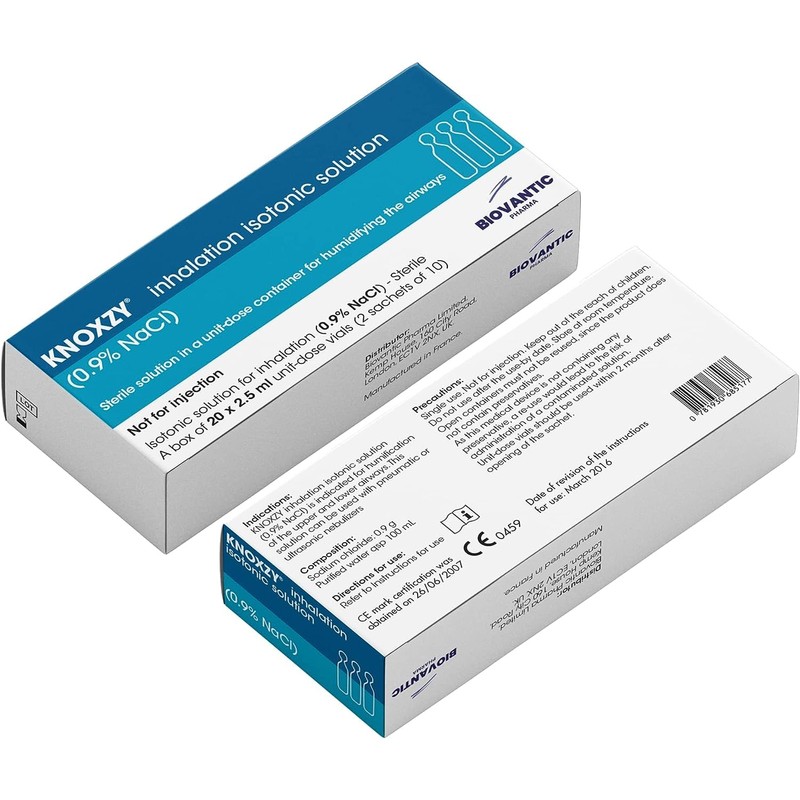 - Knoxzy Isotonic 0.9% Sodium Chloride Inhalation Saline Solution: Comes with 3 boxes of 20 x 2.5ml single-Unit-Dose-Vials. Preservative and additive-free sterile saline vials per container. Strips of ten ampoules are overwrapped in a laminate foil pack.
