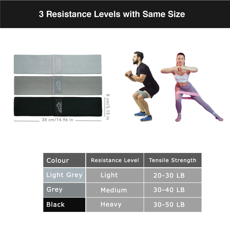 - π‘π’ π¦ππππ‘π ππ¦π¦π¨ππ¦ - Each band is 38 x 8 cm with resistance labels - light, medium, heavy. Having one consistent band size, every band fits you the same. You won't have the problem of having a βheavyβ band too small or a βlightβ band too loose. You can ramp up the intensity with varying resistance levels without worrying about unsuitable band sizes.