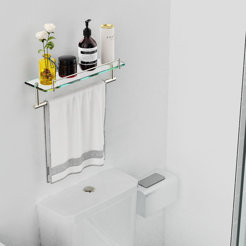 - 【DURABLE AND PRACTICAL】The towel bar, bracket and screws of this bathroom glass shelf are made of SUS 304 stainless steel to prevent corrosion and rust. The extra towel bar can also hang a bath towel or two face towels,more storage space for bathrooms.