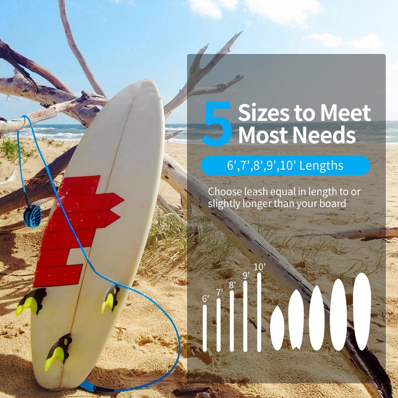 - 5 Length Options (6ft/7ft/8ft/9ft/10ft) for All Board Types:Choose the ideal size: 6ft-8ft for shortboards, 9ft-10ft for paddleboards/SUPs. A versatile surf rope for surfing, fishing, or ocean yoga.