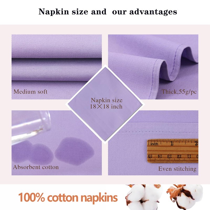 • ☀Cotton Napkins: 100% refined cotton napkins, set of 6,each napkin sized18x18 inches.Vibrant lavender cloth napkins;textured,pretty and romantic--good essentials for table setting in Spring ,Easter, weddings , baby showers,holidays...