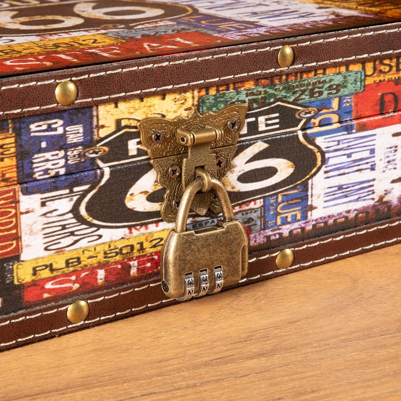 KOGLAR Wood and Leather Treasure Chest with Lid and Lock - Small Decorative Wooden Jewelry Keepsakes Storage Box for Birthday Travel Letter Home Decoration – Route 66 Pattern 10.6"×8.3"×3.7"