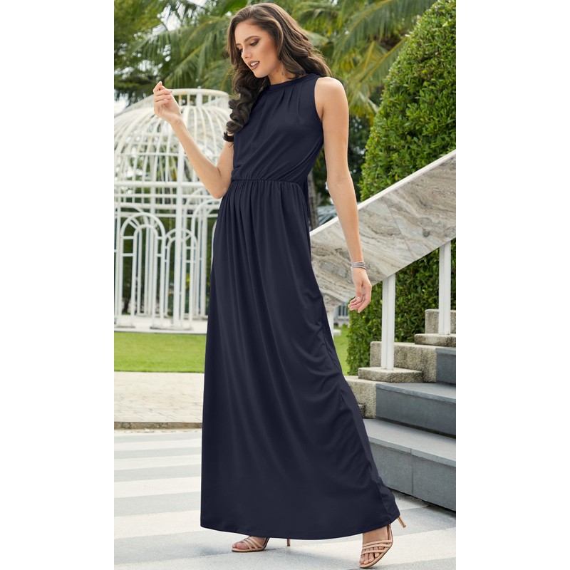KOH KOH Petite Womens Long Sleeveless Bridesmaid Halter Neck Wedding Party Guest Flowy Slimming Semi Formal Elegant Gala Ball Evening A-line Tall Gown Maxi Dress, Navy Blue S 4-6