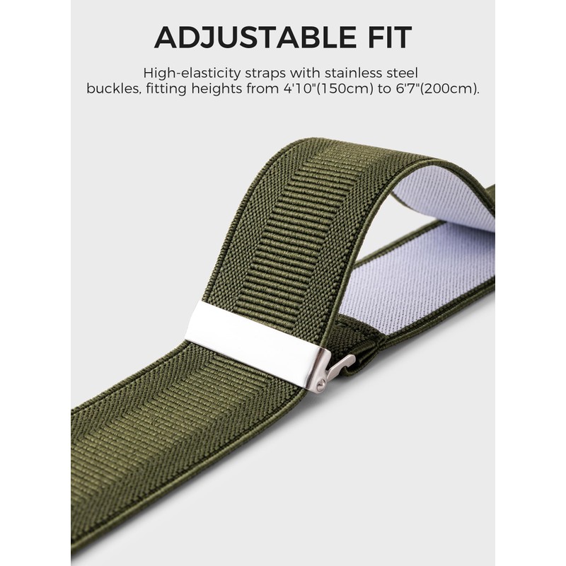 • Flexible and Adjustable: Equipped with adjustment buckles, these suspenders can fit almost any height and body type. Made from high-quality polyester webbing, 73% polyester and 27% spandex, with a width of 1.4 inches. They offer excellent elasticity, a smooth and breathable feel, and long-term comfort without discomfort. Their superior colorfastness and toughness mean they won't wear or scratch even with frequent use.