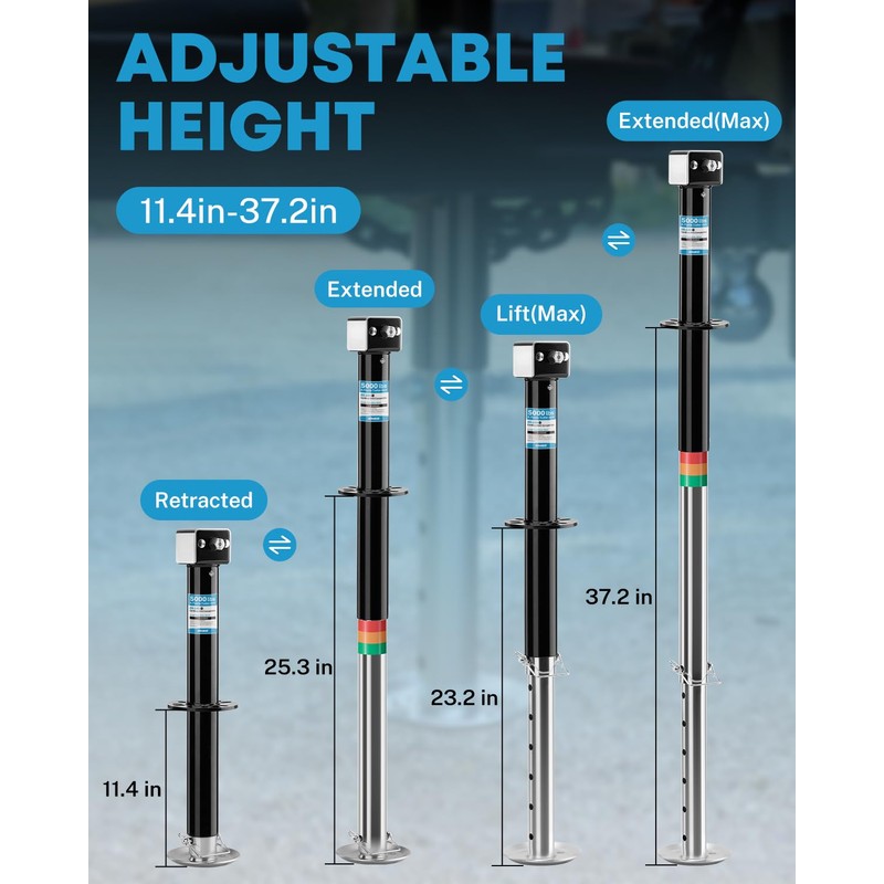 - Adjustable for Versatile Use: With a 7-level adjustable base, the trailer tongue jack offers a height range from 11.4 to 37.2 inches, making it compatible with various heights of trailers. The large and sturdy base provides stable support for your trailer