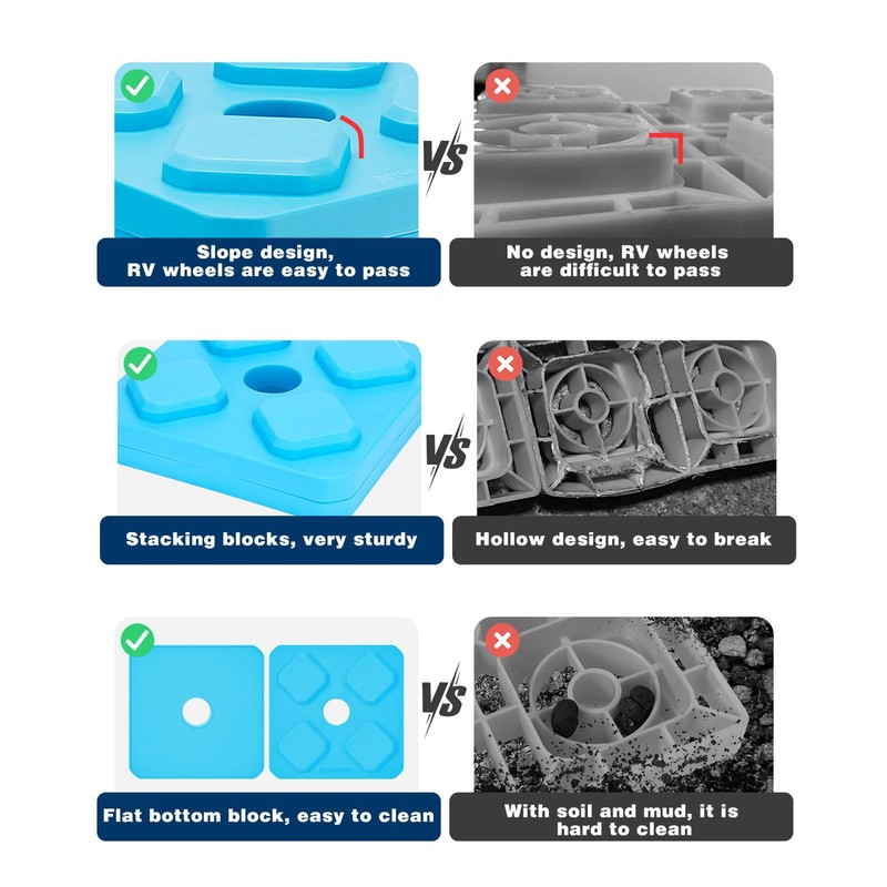 - Special Design: The slope design of the top block helps your camper wheels move easily from the ground to the leveling blocks. The flat-bottom design means you don't have to pound or dig dirt out of them after use.