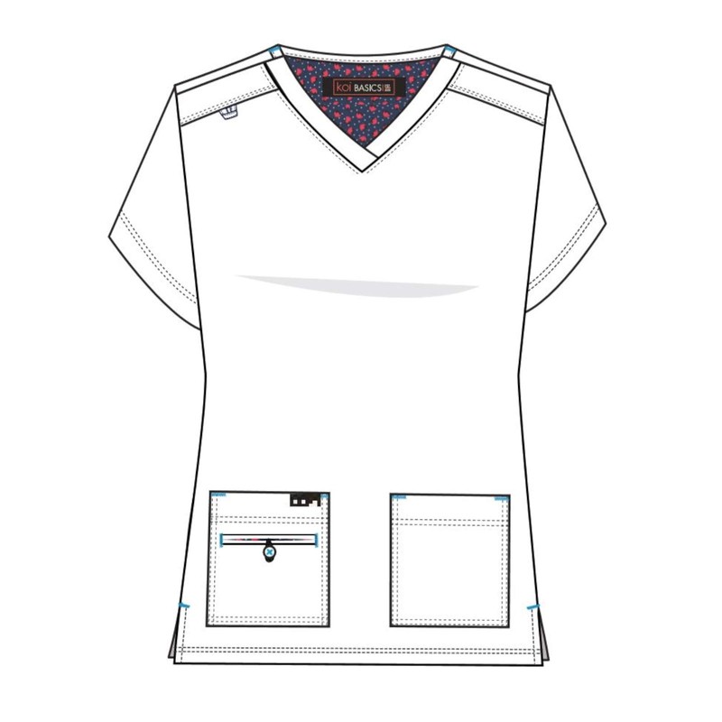 - Classic v-neck with contrast print facing at neck and bungee loop for ID Badge