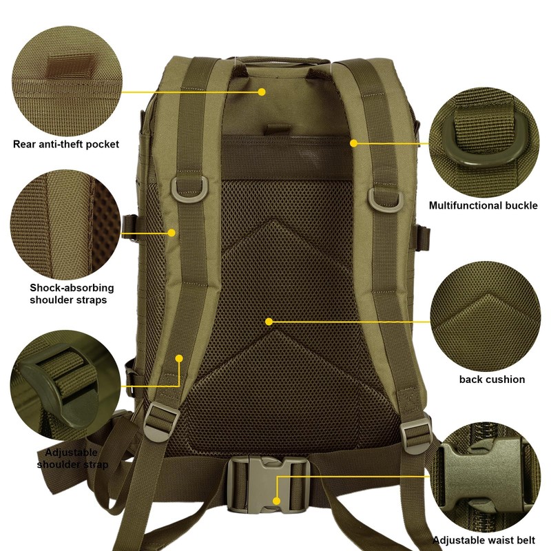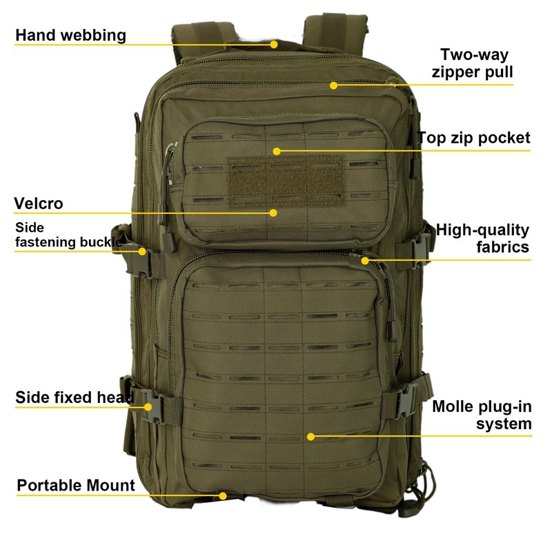- MOLLE System Tactical Backpack:Made of high-density materials, this Military backpack is durable, waterproof and of good quality.Equipped with a MOLLE webbing system for a custom fit. Reinforced heavy-duty buckles ensure durability in harsh conditions