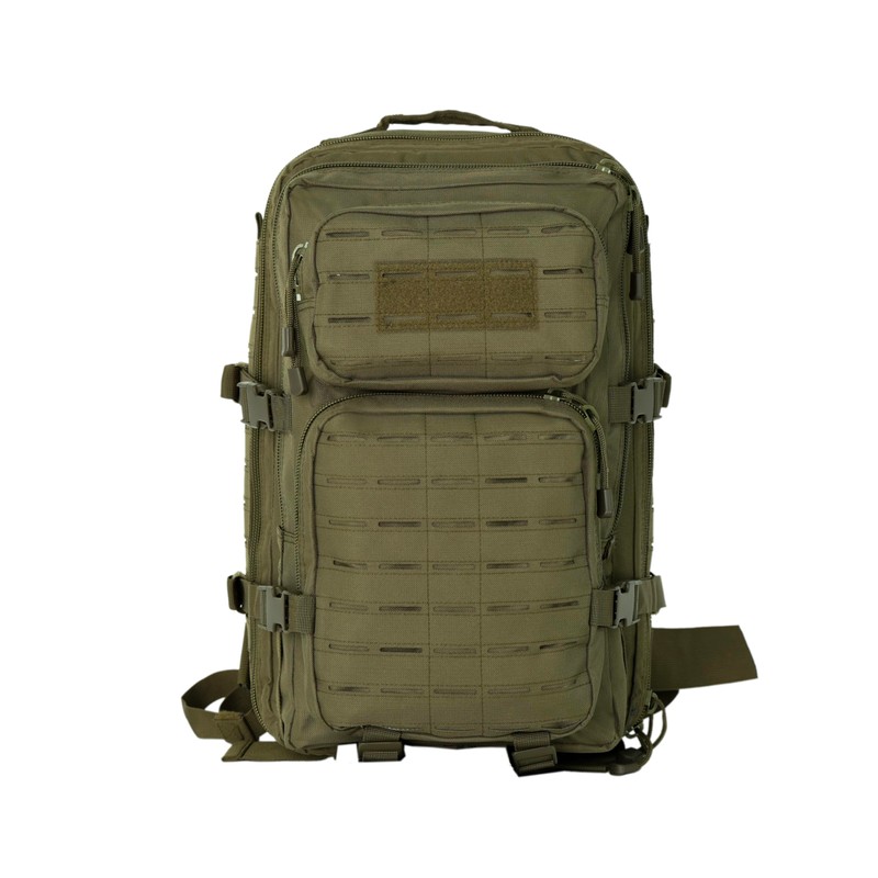 The exterior is equipped with MOLLE webbing, which allows for additional pouches, accessories, and tools to be attached, increasing customization and carrying capacity.