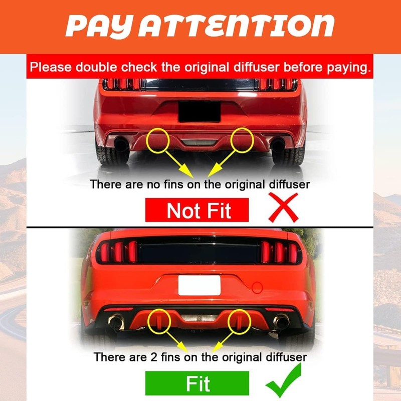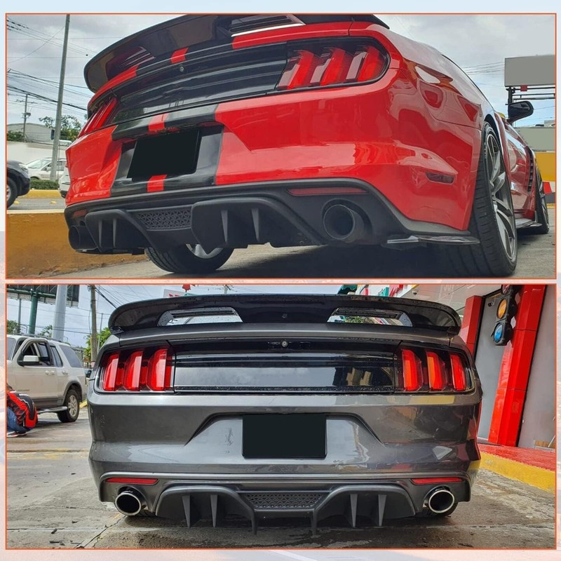 - FITMENT - Rear Bumper Lip Diffuser Compatible with 2015 2016 2017 Ford Mustang RTV2 Style. Note: Please confirm there are 2 fins on your previous diffuser before purchasing to avoid that the product is not suitable for your car.