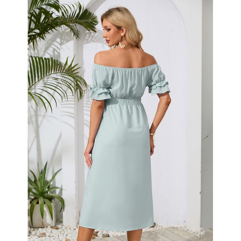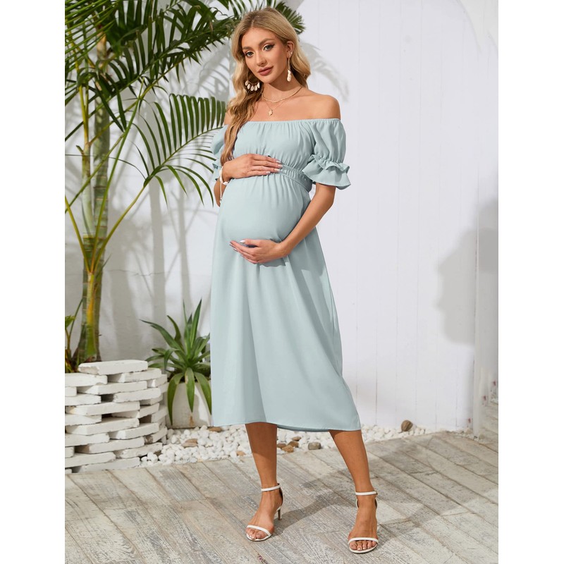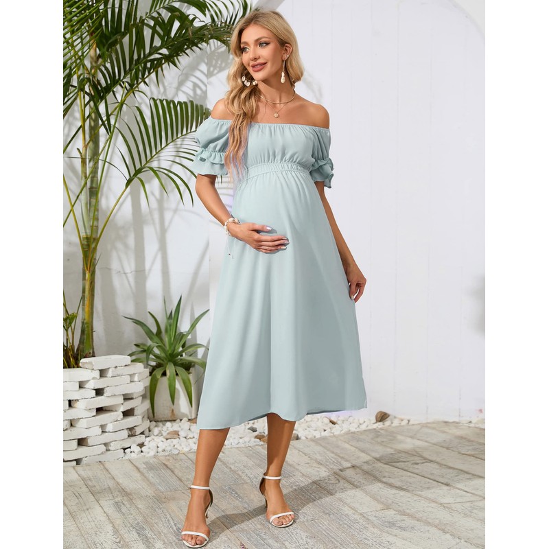 - FEATURES: The women's maternity dress is featured with off shoulder, short ruffle sleeve and high waist, maxi dress is more flowy, casual and summer maternity dress is more comfortable and cooler to wear, maternity dress for baby shower photoshoot, blue maternity dress is classic. Perfectly show your body shape, neck line and arms, easily be elegant.