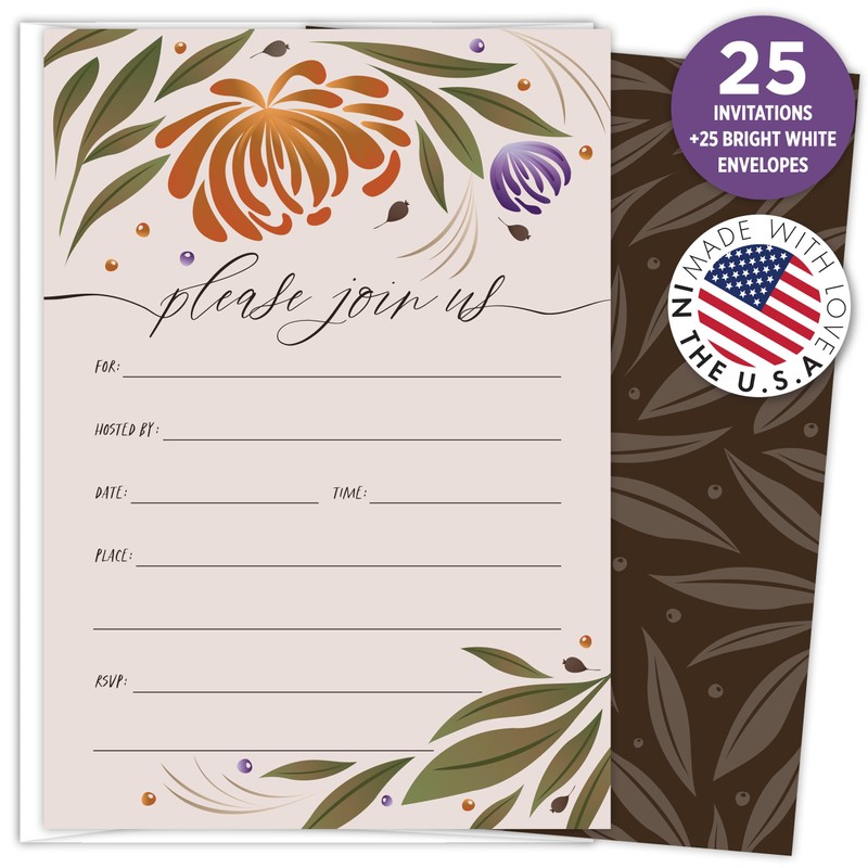 Koko Paper Co Autumn Floral Invitations for Thanksgiving Dinner and Fall Events. 25 Fill-In Invitations + 25 Bright White Envelopes. Made in the U.S.A.