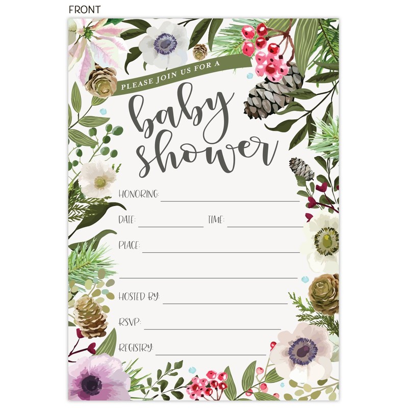 Koko Paper Co Winter Baby Shower Invitations with Rustic Winter Florals. Set of 25 Fill in The Blank Style Invites and Kraft Envelopes. Printed on Front and Back.