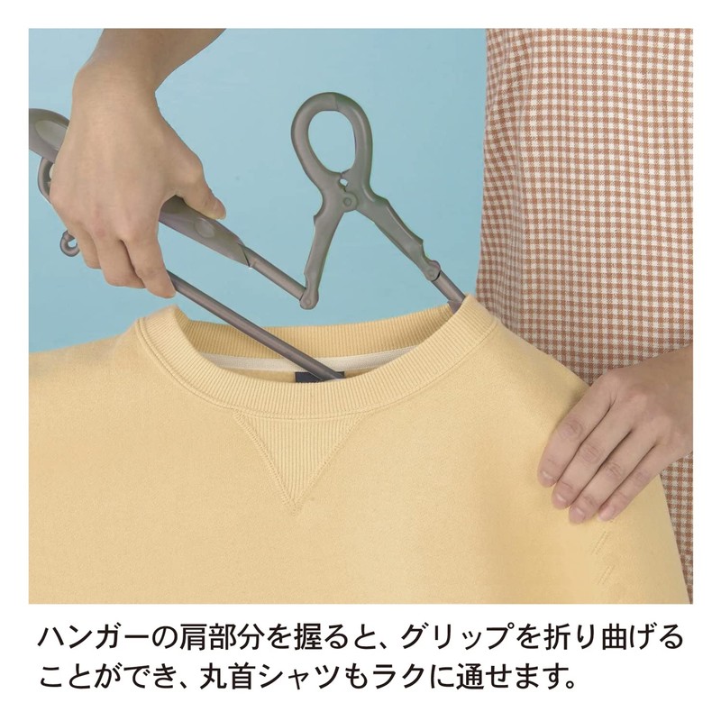 - (Convenient and Easy to Wear on Clothes) The grip portion is bendable, so you can easily put it in without stretching it even with round neck shirts, thick trainers, hoodies, etc. It also comes with a clip that can hold towels and other items on the left and right bar under the hanger, and a hook for hanging skirts and tank tops