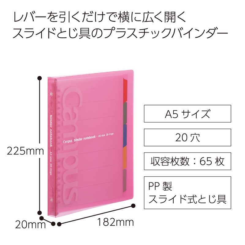 Kokuyo Campus Slim Binder Notebook, A5, 20 Holes, safety pink