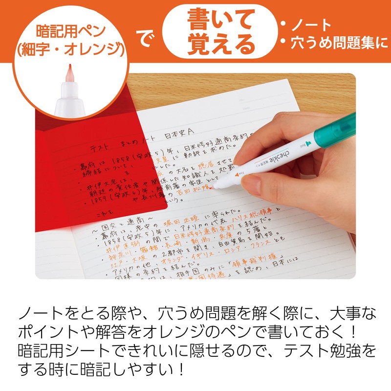 • Pen Specifications: Memorization pen: Medium-size core, green, orange (fine tip) / Memorization eraser pen: Medium-size core, transparent (eraser ink)