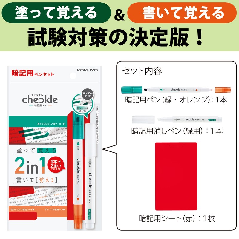 • Set Contents: Memorization pen (green and orange), memorization eraser pen, memorization sheet (red)