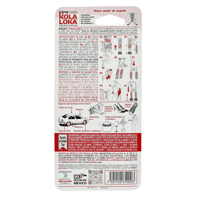 - Una Gota Sostiene Una Tonelada: Con la fórmula avanzada de Kola Loka, una sola gota de este poderoso pegamento es suficiente para sostener una tonelada, ofreciendo una resistencia excepcional para diversas aplicaciones.