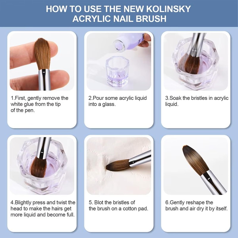 - 【Clean and Storage】After every application on single nail, make sure to clean the acrylic brush with brush cleaner to prevent the acrylic powder from clumping.Do not use acetone, it will remove the shine, make acrylic tacky and buildup residue. After cleaning, remove moisture with a paper towel, reshape, and keep it in the upright position..