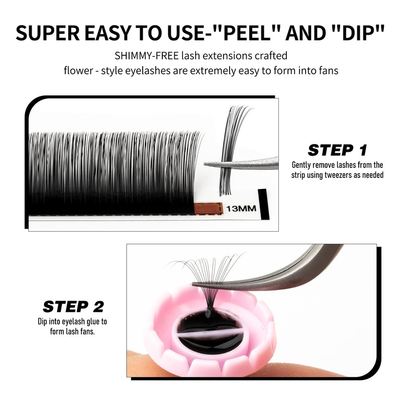- Stable Curl & Long Lasting Look : SHIMMY-FREE lash extensions crafted flower - style eyelashes are extremely easy to form into fans, with high density and a super matte texture. Eyelash extensions have a long lasting curl, are not prone to deformation and spring back, and can maintain a beautiful shape for a long time, adding charm to the eyes.