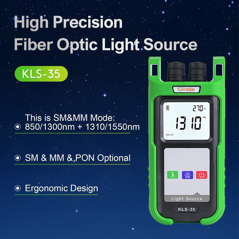The KomShine KLS-35 Light Source provides excellent stability and high measurement accuracy for up to two single mode wavelengths. It is the perfect complement to the KPM-35 Power Meter when it comes to measuring attenuation on fiber-optic links