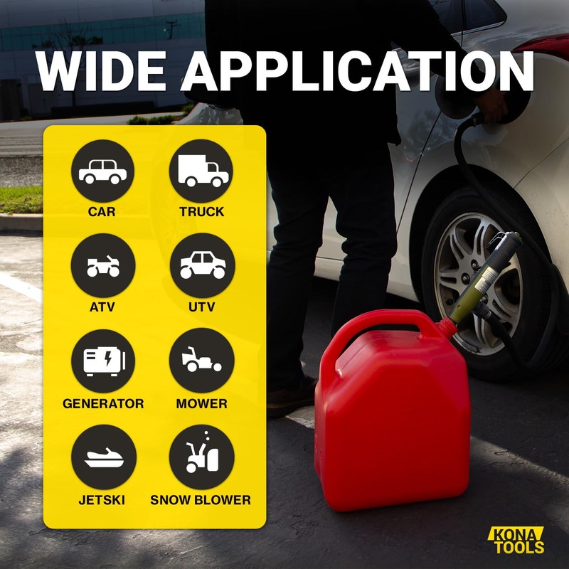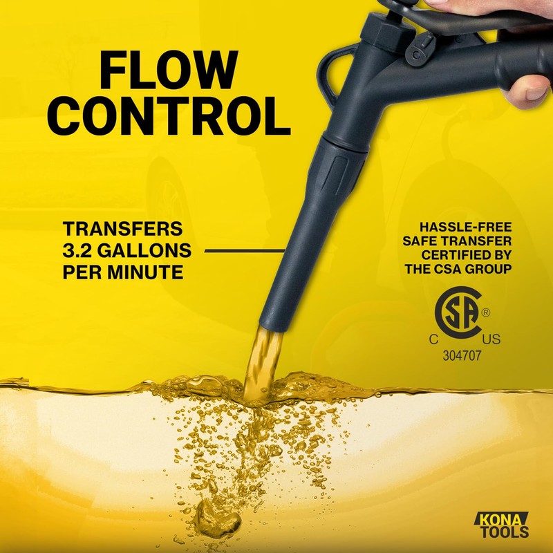 Make refueling faster, cleaner, and more convenient with the Kona Tools KTEP01MR battery powered fuel transfer pump with manual control nozzle. Engineered for efficiency and versatility, this pump delivers a powerful 3.2GPM flow rate which can handle gasoline, diesel, kerosene, light oils, and non-potable water. The stick pump fits most standard fuel containers, while the long flexible discharge hose allows you to pump with ease and flexibility. Fill your car without needing to lift the gas can! Whether you're servicing vehicles, filling up equipment, or transferring fluids in your garage or on the farm, the Kona Tools KTEP01MR is the ultimate battery-powered solution for safe, quick, and clean fuel transfers.