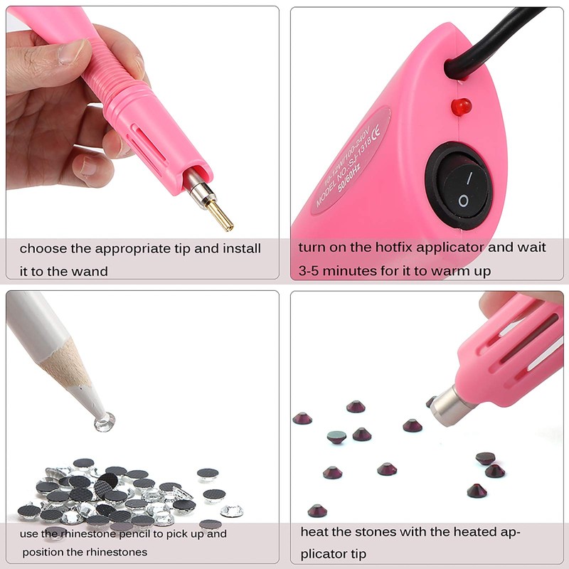 - Application The rhinestone hot pressing tools set is easy to use. Just place the tip of the heated rhinestone applicator on T-shirts, purses, shoes, jeans, etc. and you can create any drawing for these items.
